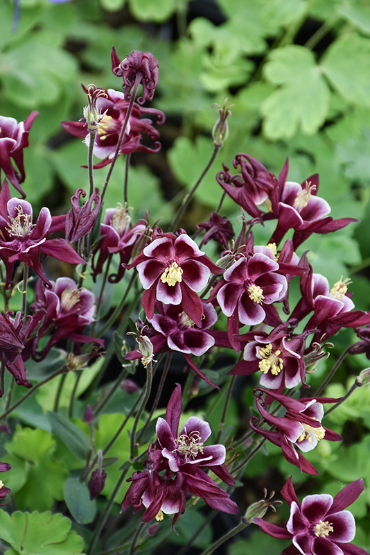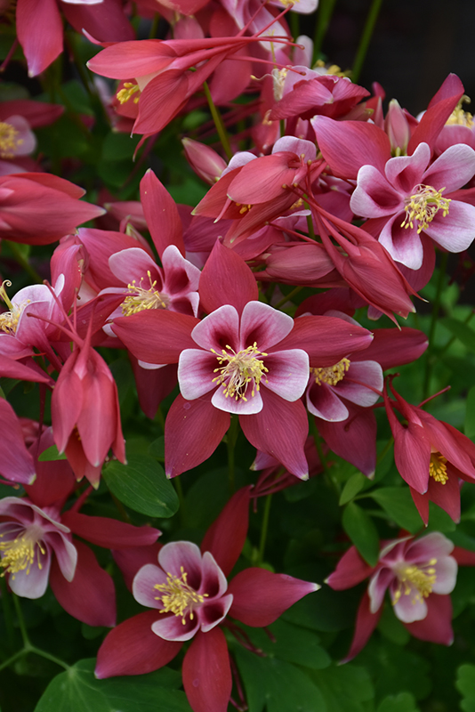 Winky Red And White Columbine features showy double red bell-shaped flowers with white overtones and buttery yellow eyes at the ends of the stems from late spring to early summer, which emerge from distinctive burgundy flower buds. The flowers are excellent for cutting. Its lobed compound leaves remain green in colour throughout the season.