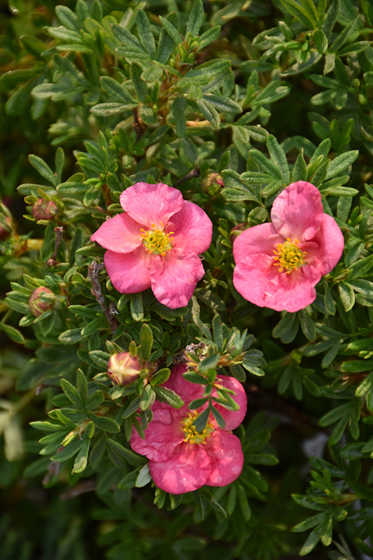 Bella Bellissima™ Potentilla features showy rose flowers with gold eyes at the ends of the branches from late spring to early fall. It has light green deciduous foliage. The small ferny compound leaves do not develop any appreciable fall colour.