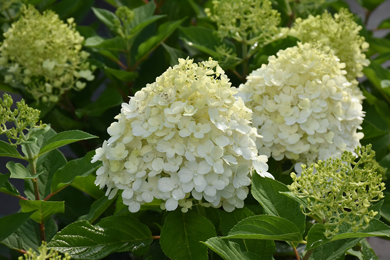 Fire Light Tidbit® Hydrangea features bold conical white flowers with pink overtones at the ends of the branches from mid summer to late fall. The flowers are excellent for cutting. It has green deciduous foliage. The pointy leaves do not develop any appreciable fall colour.