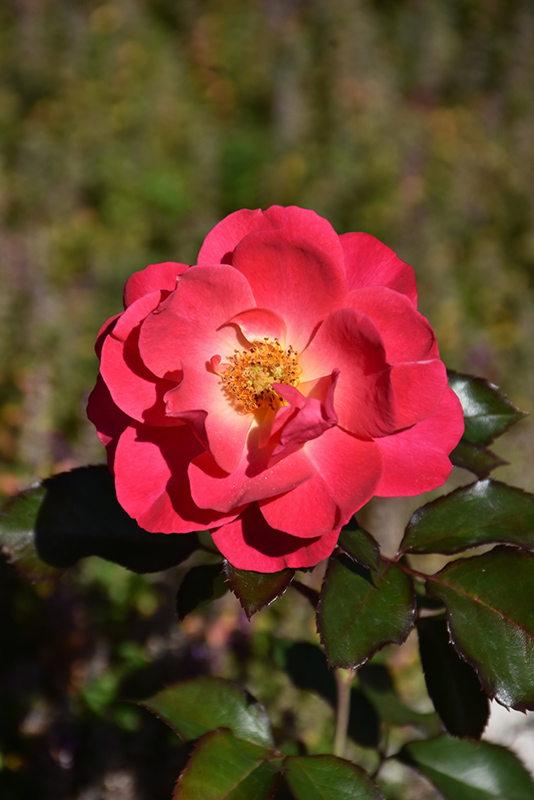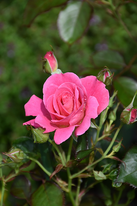 Aurora Borealis® Rose features showy clusters of double coral-pink flowers with rose overtones and gold eyes at the ends of the branches from late spring to mid fall. The flowers are excellent for cutting. It has dark green foliage edged in burgundy. The glossy oval compound leaves turn yellow in fall. The spiny brick red bark adds an interesting dimension to the landscape.