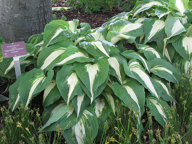 Night Before Christmas Hosta will grow to be about 18 inches tall at maturity extending to 28 inches tall with the flowers, with a spread of 4 feet. When grown in masses or used as a bedding plant, individual plants should be spaced approximately 4 feet apart. Its foliage tends to remain dense right to the ground, not requiring facer plants in front. It grows at a medium rate, and under ideal conditions can be expected to live for approximately 10 years. As an herbaceous perennial, this plant will usually die back to the crown each winter, and will regrow from the base each spring. Be careful not to disturb the crown in late winter when it may not be readily seen!