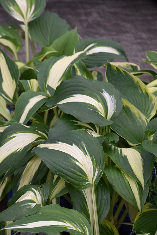 An eye-catching medium to large sized variety featuring mounds of thick, dark green foliage with striking creamy white centers which progress to bright white by midsummer; pale lavender flowers appear on tall scapes in mid to late summer; low maintenance