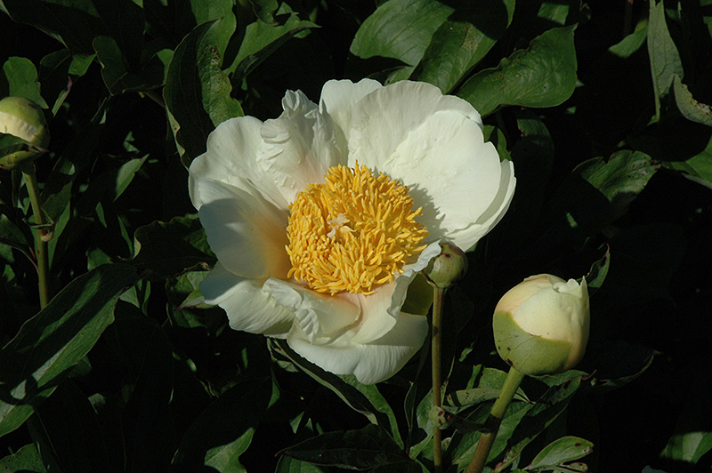 Claire de Lune Peony features bold lightly-scented creamy white cup-shaped flowers with yellow centers at the ends of the stems from early to mid summer. The flowers are excellent for cutting. Its compound leaves remain dark green in colour throughout the season.